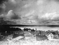 Thomas Chambers' grist mill on Chambers Bay. Abitibi paper mill was (in recent times) just to the right, and the Steilacoom Marina to the left. Outlet of Chambers Bay is seen in the background.
