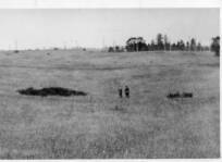 Site of Chief Leschi hanging. On the prairie (Steilacoom Boulevard would be in the background). Ezra Meeker and Stephen Judson shown in photo.