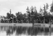 Steilacoom water front showing Balch home in foreground. In background, left to right, O'Donnell home, Masonic Temple (according to caption), Bair Drugs, monument, E.R. Rogers home, Doering home.